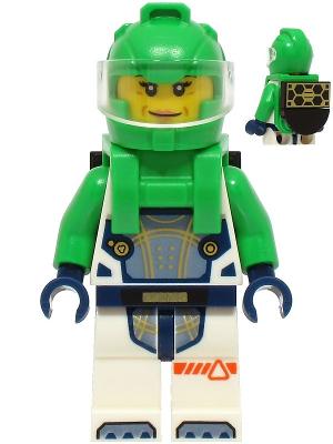 Astronaut - Female, White Spacesuit with Bright Green Arms, Bright Green Helmet, Trans-Clear Visor, Bright Green Harness with Solar Panel, Closed Mouth