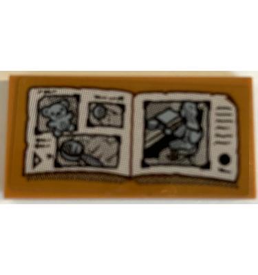 Tile 2 x 4 with Open Book with Teddy Bear, Magnifying Glass, Black Writing and Circle Pattern (Sticker) - Set 70425