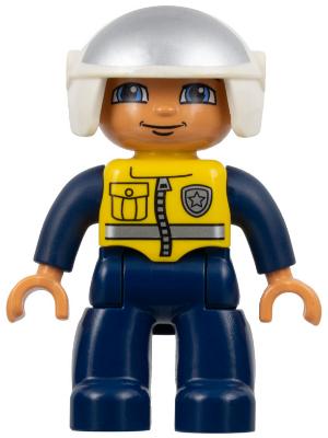 Duplo Figure Lego Ville, Male Police, Dark Blue Legs and Jumpsuit with Yellow Vest, White Helmet															A képen látható állapotban, minőségben és mennyiségben.