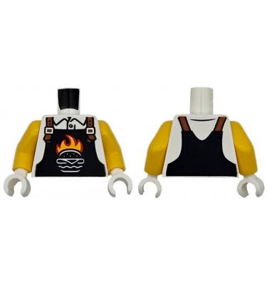 Torso Black Overalls with Burger Outline, Red and Bright Light Orange Flames and Dark Orange Straps over Shirt Pattern / Yellow Arms / White Hands