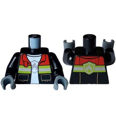 Torso Fire Jacket Open with Pockets, Red Collar, and Silver and Lime Reflective Stripes over White T-Shirt with Fire Logo Badge Pattern / Black Arms / Dark Bluish Gray Hands A képen látható állapotban, minőségben és mennyiségben.