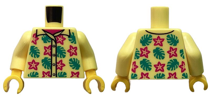 Torso Hawaiian Shirt with Buttons, Magenta Flowers and Dark Turquoise Leaves over Undershirt Pattern / Bright Light Yellow Arms / Yellow Hands