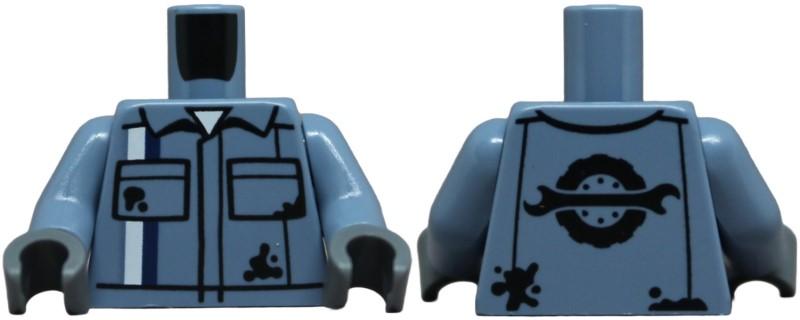 Torso Mechanic Uniform with White and Dark Blue Stripes, Black Oil Stains and Pockets over Shirt, Spanner Wrench and Wheel with Tire Logo on Back Pattern / Sand Blue Arms / Dark Bluish Gray Hands