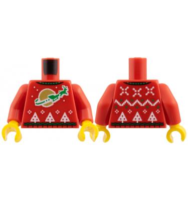 Torso Knit Fair Isle Holiday Sweater, Green Collar and Reindeer Sleigh, Gold Classic Space Moon, White Snowflakes and Christmas Trees Pattern / Red Arms / Yellow Hands