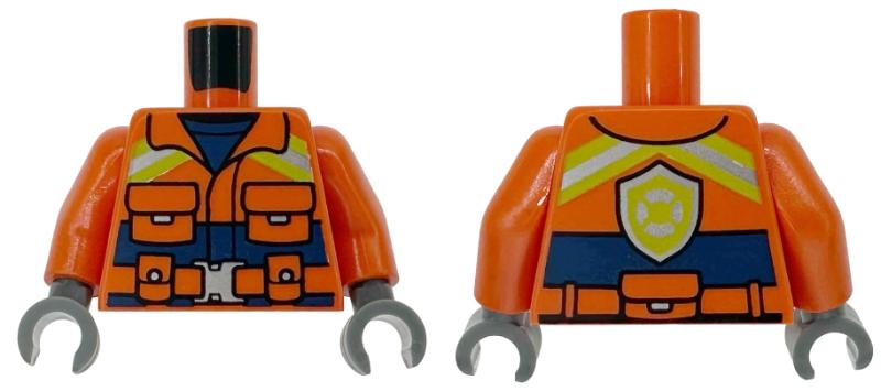 Torso Jacket with Pockets, Dark Blue Panel, Lime and Silver Reflective Stripes, Belt with Buckle, Coast Guard Logo on Back Pattern / Reddish Orange Arms / Dark Bluish Gray Hands