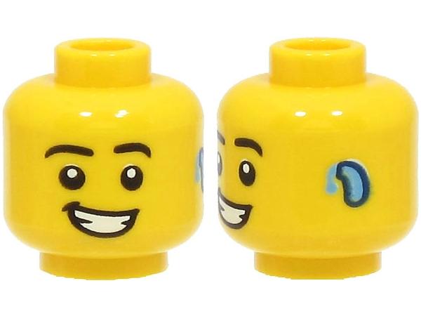 Minifigure, Head Black Eyebrows, Bright Light Blue Hearing Aid on Left, Lopsided Open Mouth Smile with Teeth Pattern