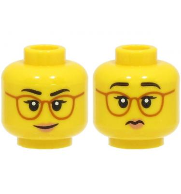 Minifigure, Head Dual Sided Female Black Eyebrows, Dark Orange Glasses, Medium Nougat Lips, Lopsided Grin / Frown Pattern A képen látható állapotban, minőségben és mennyiségben.