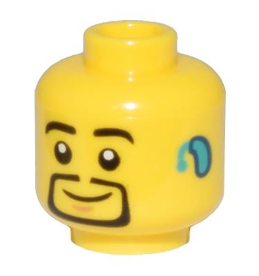 Minifigure, Head Black Eyebrows and Thin Goatee, Nougat Chin Dimple, Dark Turquoise Hearing Aid on Left, Grin Pattern