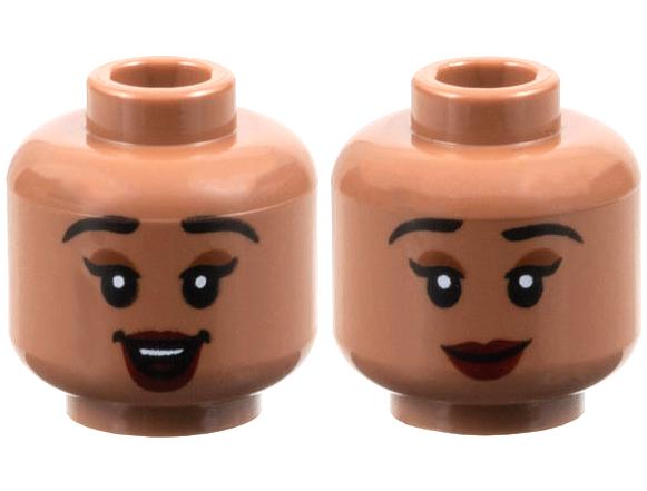 Minifigure, Head Dual Sided Female Black Eyebrows, Reddish Brown Eye Shadow, Dark Red Lips, Open Mouth Smile / Closed Mouth Smile Pattern