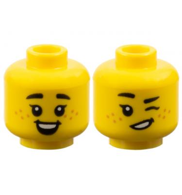 Minifigure, Head Dual Sided Child Female Black Small Thick Eyebrows, Single Eyelashes, Medium Nougat Freckles, Open Mouth Smile with Dimples and Top Teeth / Winking Pattern A képen látható állapotban, minőségben és mennyiségben.