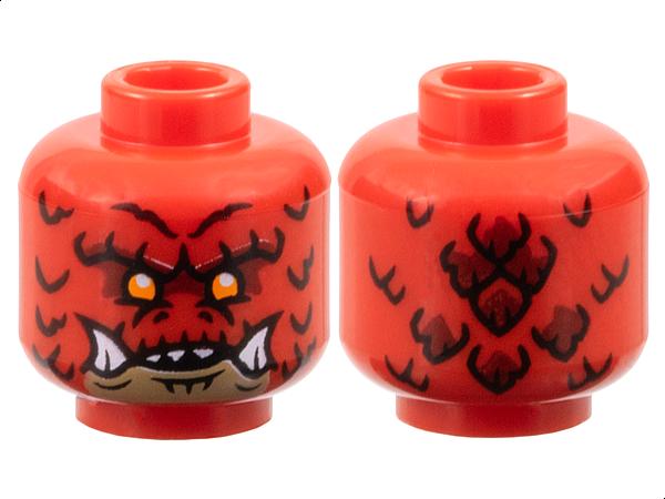 Minifigure, Head Alien Dragon with Orange Eyes, Dark Red Eye Shadow, Dark Tan Chin, Scales, Nostrils, Pronounced Brow, Open Mouth with Sharp Top Teeth and Bottom Fangs Pattern