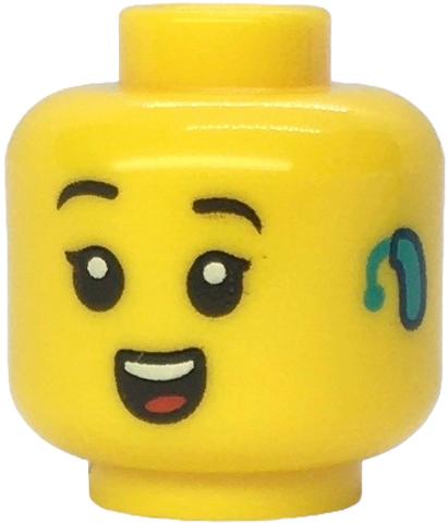 Minifigure, Head Child Female Black Raised Eyebrows, Single Eyelashes, Dark Turquoise Hearing Aid on Left, Open Mouth Smile with Top Teeth and Red Tongue Pattern