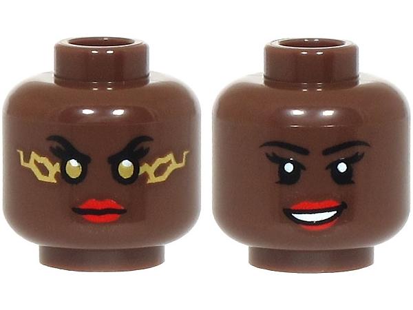 Minifigure, Head Dual Sided Female Black Eyebrows, Double Eyelashes, Red Lips, Stern with Gold Eyes and Energy / Open Mouth Smile with Teeth, Lower Eyelids Pattern